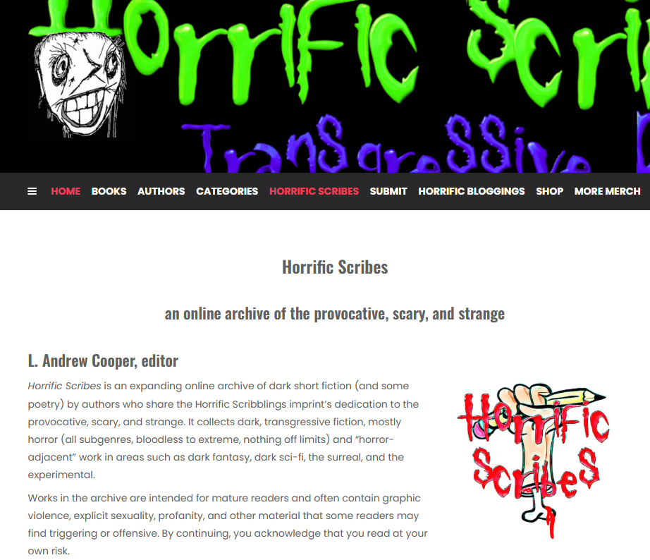 Horrific Scribes je horor zine iz SAD-a (Holivud, Kalifornija) koji periodično objavljuje šrampane zbirke i zaista vodi računa o autorima — svako dobija svoju autorsku stranicu, ažuriraju se bibliografije itd., tako da sam više nego zadovoljan saradnjom. Već sam kod njih objavio priču „Oglas“ (možete je besplatno preuzeti sa mog sajta), pa polako postajem redovan contributor i gradim lepu saradnju sa urednikom Endrjuom Kuperom. 🤝