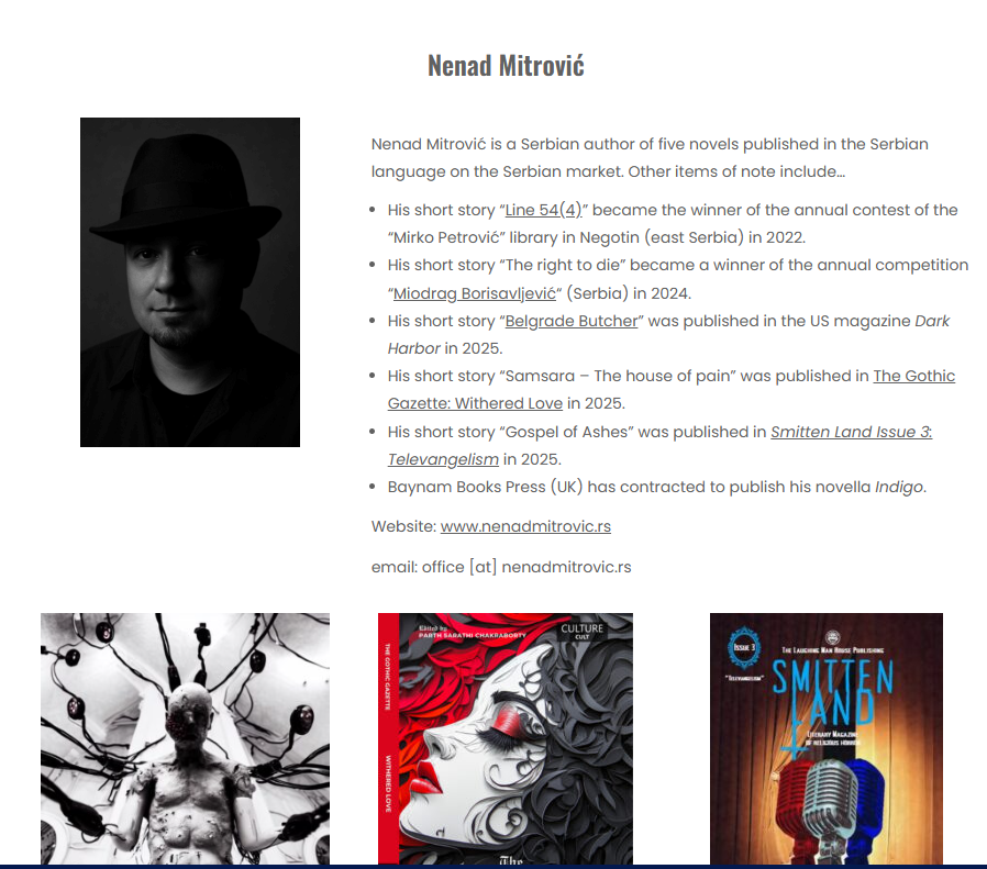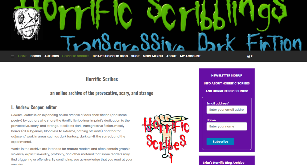 Pozdrav drugari, nakupilo se dovoljno materijala da vam predstavim nove stvari na kojima sam radio, kao i ono što je u međuvremenu objavljeno. Kao što znate (neki od vas, svakako) u poslednjih godinu dana pišem kratku fantastičnu prozu na engleskom, pa sam imao tu priliku da nešto od napisanog, jelte, i objavim. Ovog puta vam predstavljam sajt i magazin Horrific Scriblings iz Kalifornije gde sam objavio psiho-horor priču „Oglas“ (iliti „An Advertisement“) za mene neuobičajeno kratku, od nekih 3000 reči. Urednik me je zamolio da linkujem glavnu stranu, pa vi malo protrčite unaokolo, vidite da li ima nešto što vas zanima. Što se moje priče tiče – It’s an ad you can’t resist! kaže u opisu, i mislim da sam uspeo da stvorim jednog nesvakidašnjeg zlikovca